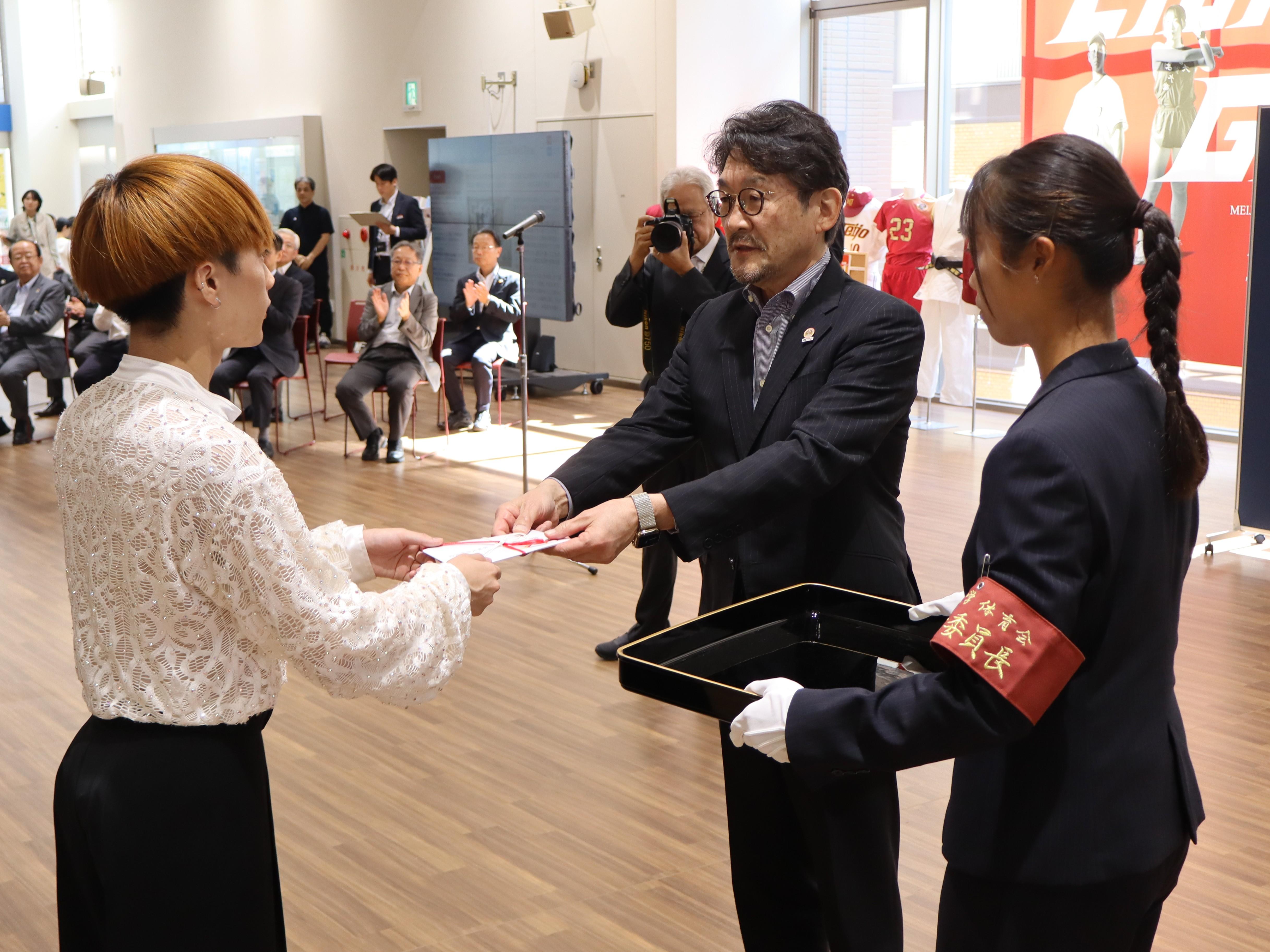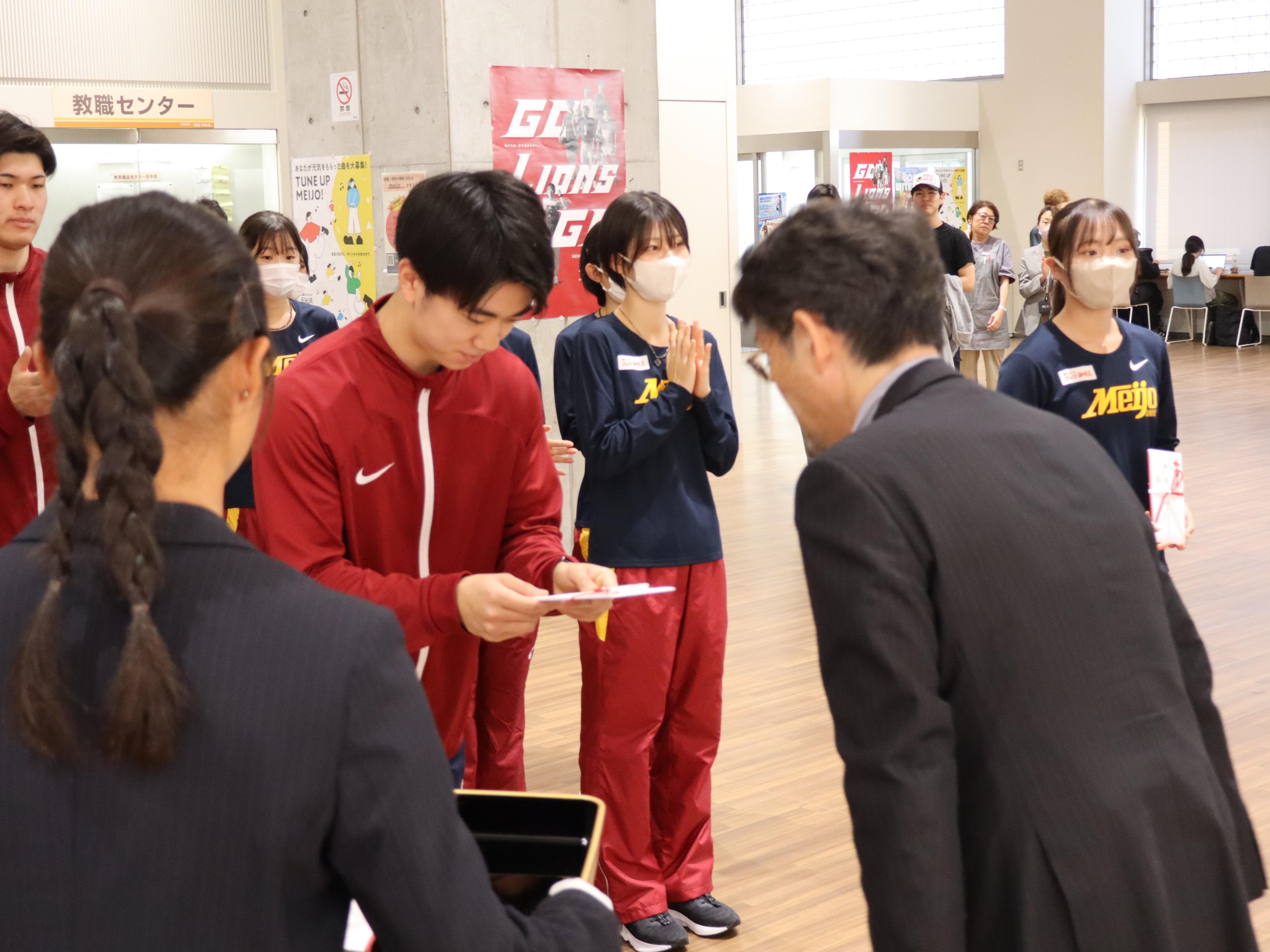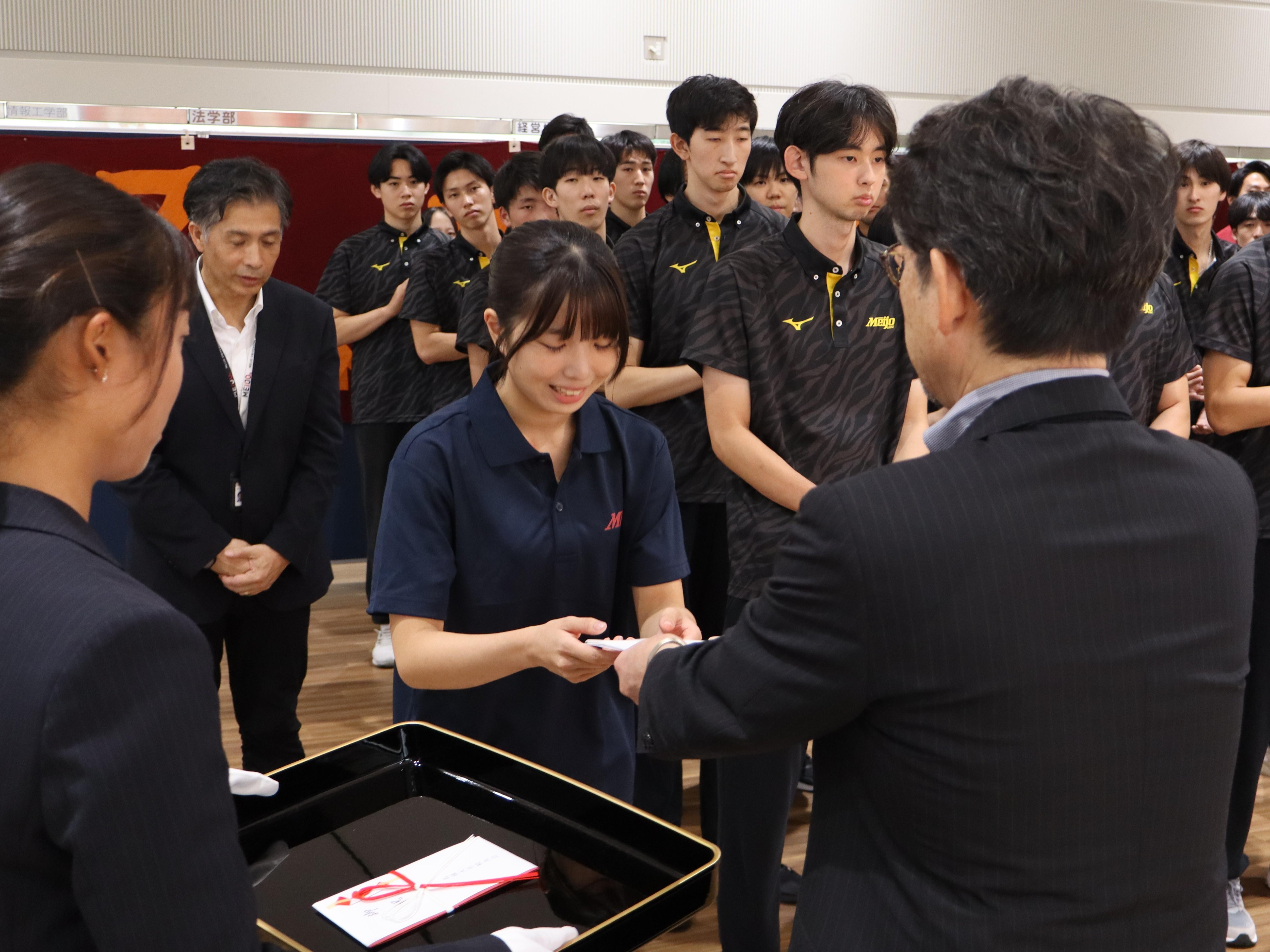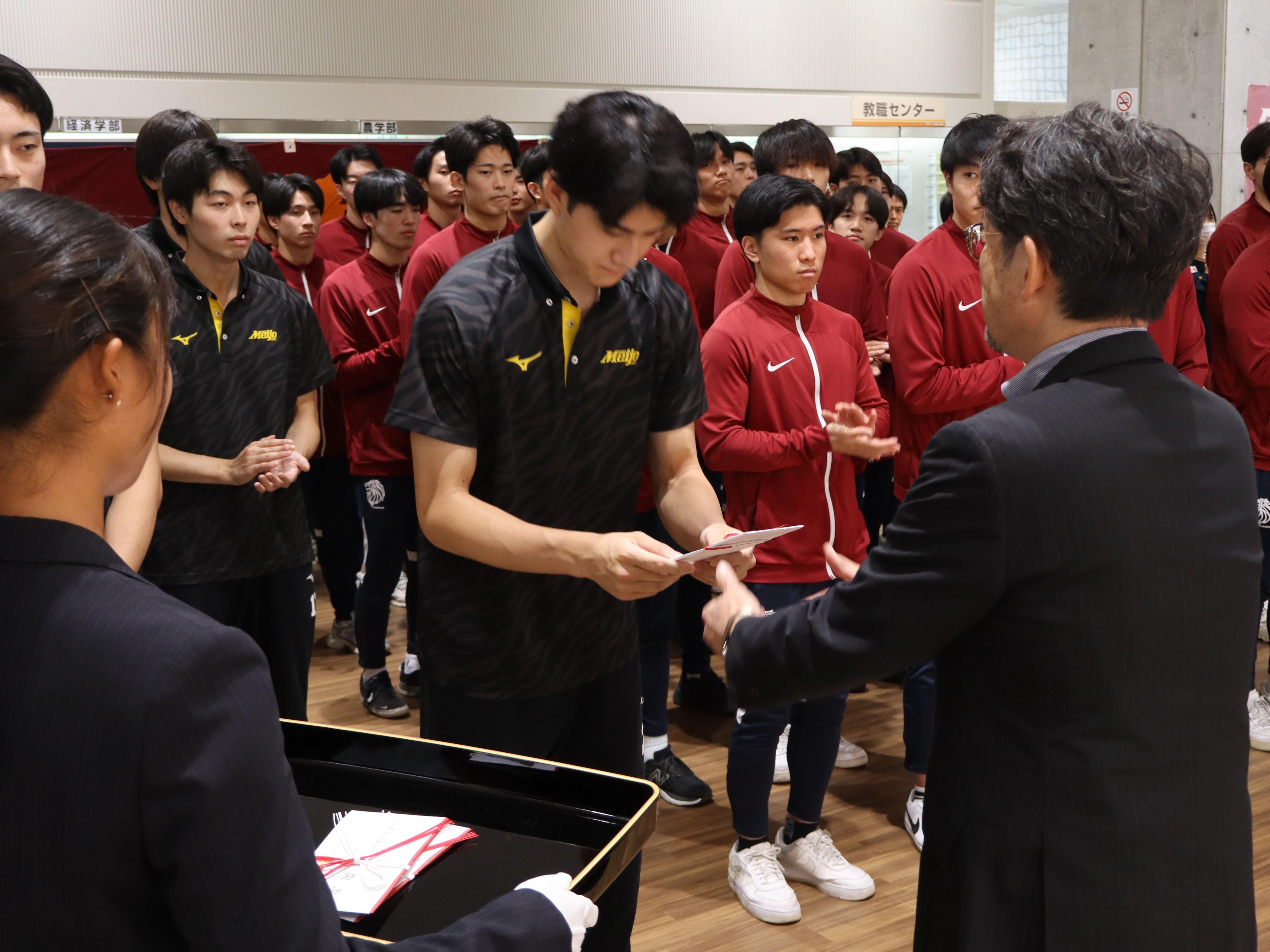 体育会主催の全国大会出場クラブの壮行会で校友会からの援助金の贈呈を行いました